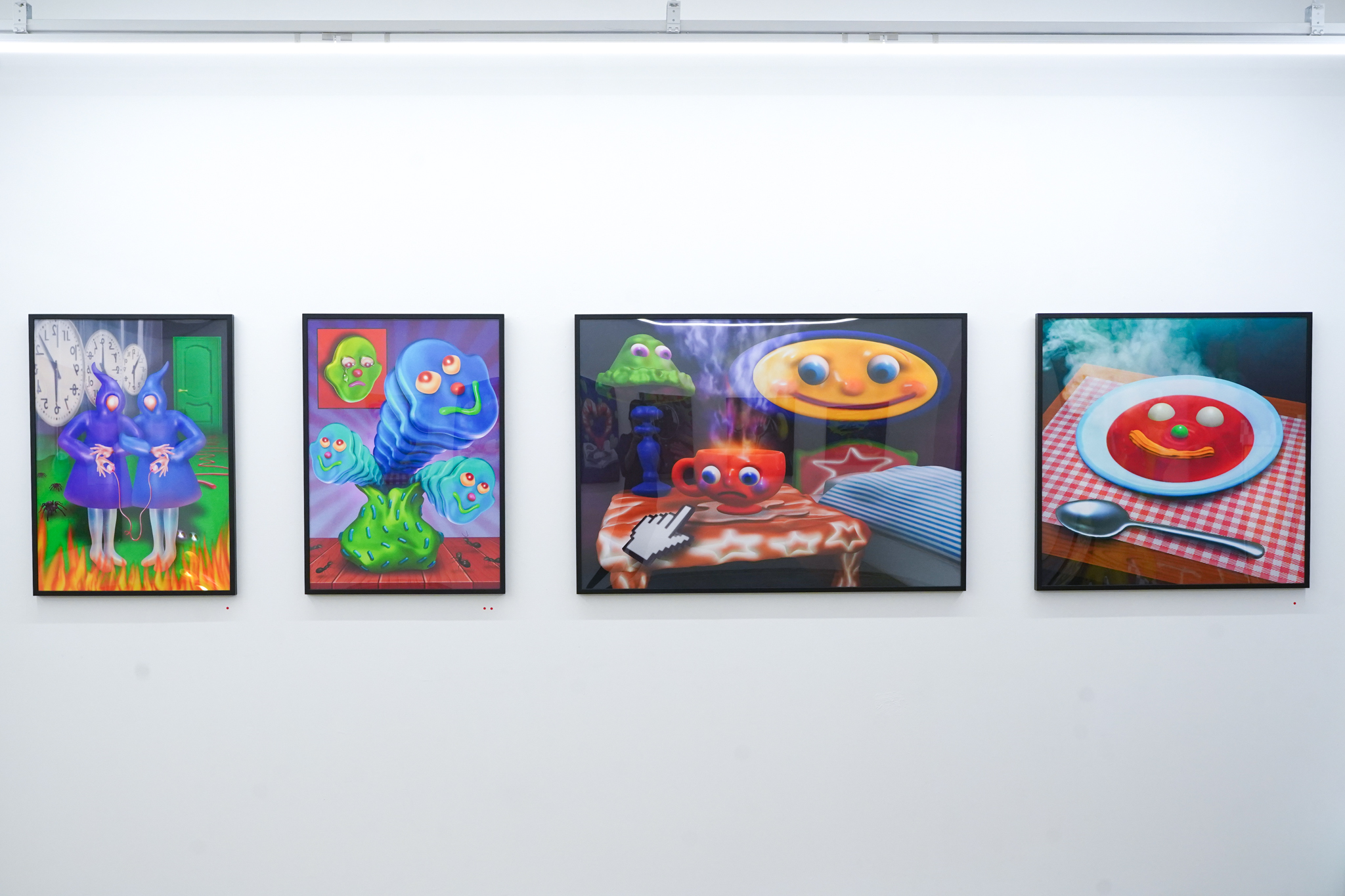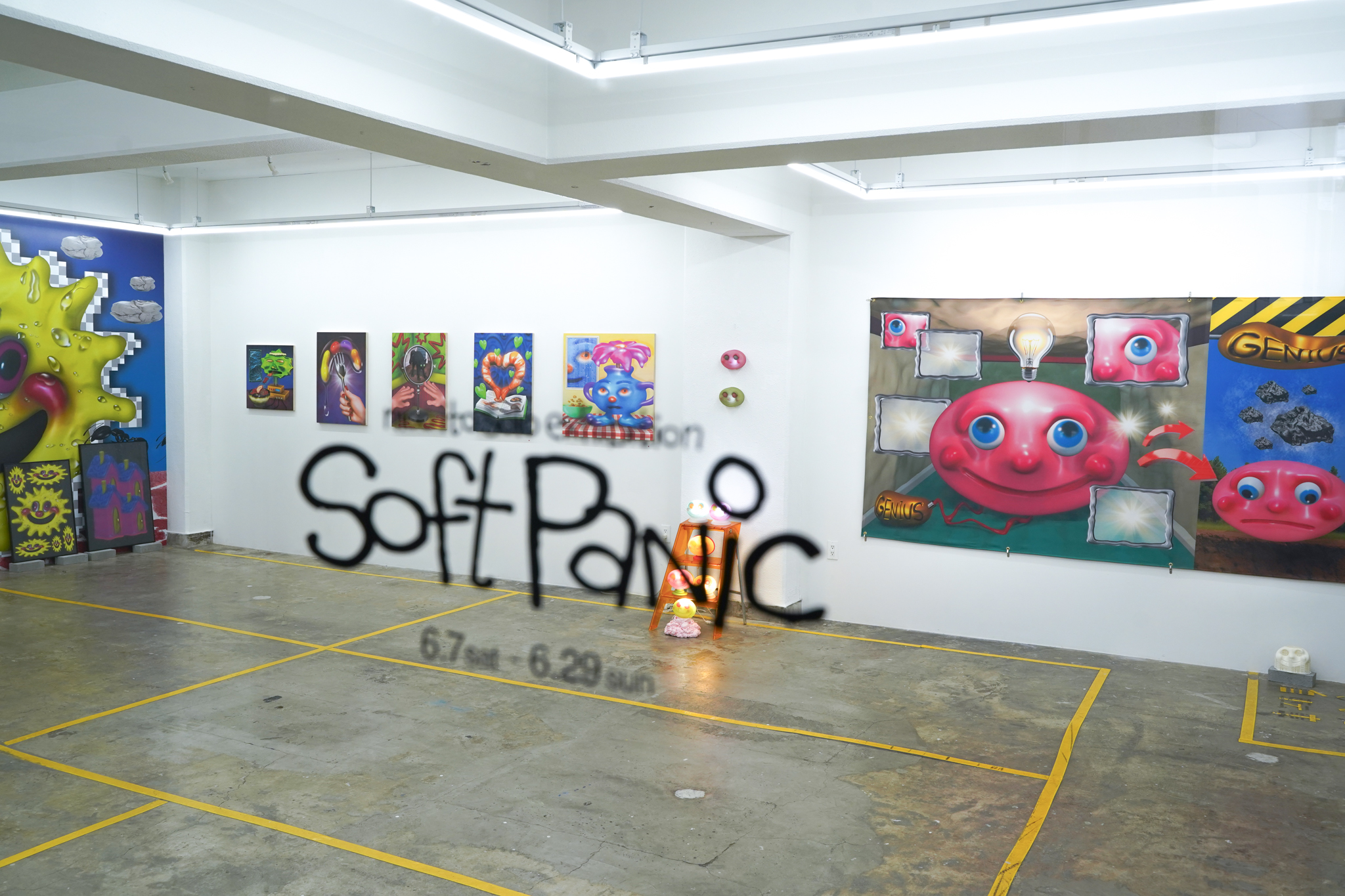 「起きた出来事をそのまま描くのではなく、別のキャタクターやモチーフを主役にして再構築しています。今回の展示ではネガティブめな感情がもとになっている作品が多いのですが、不穏さは残しつつ重くなり過ぎないよう、ポップで親しみやすい表現をしているつもりです。また、キャラクターはどんな表情でも”愛おしさ”が生まれるように意識しています」。